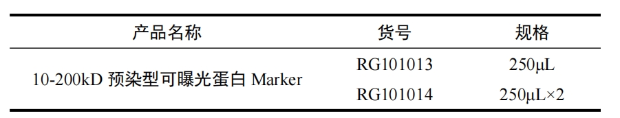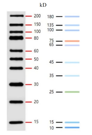 本产品是一种预染即用型蛋白分子量标准品,分子量范围为10-200kD,其中10条预染蛋白Marker条带(10, 15, 25, 35, 45, 65, 75, 100, 135,180kD),全程检测电泳与转膜。10条曝光Marker条带(15,20,30,40,50,60,80,100,150,200kD)与目的蛋白一同ECL曝光显色,指示分子量大小。