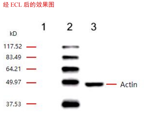 本产品含有6个可自发光的纯化蛋白质,分子量介于23至117kD之间,且均携带有能被小鼠、兔子及山羊等多种抗体所识别的基团。当进行化学发光(ECL)检测时,6个蛋白质由于结合了相应的抗体,也可以发光,从而达到自发光的效果。本产品发出的光与目的蛋白质条带发的光一样,可以通过X光胶片曝光或者ECL发光成像仪进行检测。